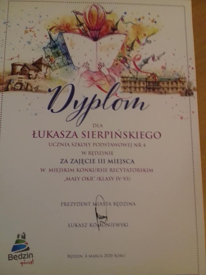 Mały OKR Łukasz Sierpiński zajął III miejsce w konkursie recytatorskim "Mały OKR". Serdecznie gratulujemy.